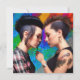 Two beautiful woman in love lesbians lgbtqia+ couple with rainbow background. One woman playing with the other women's hair.