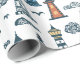 Cute lighthouse pattern in various styles and shapes on white background. Simple drawn seagulls, swirly clouds and waves in design too.