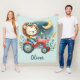 Adorable personalised fleece blanket featuring a cute lion driving a charming red tractor at night with a view of the moon.