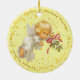 Brighten up your Christmas tree and give a touch of warmth and excitement of the holidays to your Christmas decoration with this charming circle ceramic Christmas tree ornament. Featuring an illustration of Cute Little Angel holding mistletoe against a faux golden little stars backdrop on yellow cream background, this charming ornament is a perfect way to commemorate the holiday season with your family and makes a great gift for all of your loved ones.