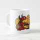 Cute little monsters having a coffee, a piece of cherry chocolate cake and an iced drink. All in autumn colours, one of them dressed as a vampire. Concept of warm beverages, friendship and Halloween.