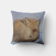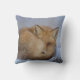 A pillow with a darling nature photograph featuring a cute little red fox all curled up in a ball resting on the cold winter snow.