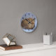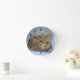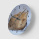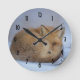 A clock with a darling nature photograph featuring a cute little red fox all curled up in a ball resting on the cold winter snow.