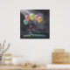 A cute little girl wearing a pink shirt and blue skirt stands holding five colourful balloons. She is bringing a patch of brightness to a dark world. In the distance is a grey building surrounded by mist and dark trees and mountains.