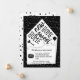 Adorable moving announcement invitation cards with a quirky, fun little house with the new address details inside and the hand-lettered "New Home Sweet Home" on top with a key and a balloon. On the back is a cute black and white pattern illustration of a bike, car, key, air balloon and "We've moved!" text
