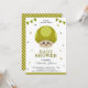 Amaze your guests with this cute baby shower invite featuring an adorable little mushroom with vibrant elements against a white background. Simply add your event details on this easy-to-use template to make it a one-of-a-kind invitation. Flip the card over to reveal an elegant green and white stripes pattern on the back of the card.