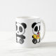 Three adorable little pandas sitting beside each other. One happy panda is wearing a tee shirt with "I heart panda" written on it. Another is offering a green bamboo stick to a third panda that has fallen asleep.