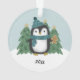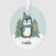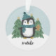 This adorable Christmas ornament features a hand drawn penguin, wearing a hat and scarf in teal blue. He's standing in front of some Christmas trees and holding a gingerbread man cookie, while it's snowing in the background. A text template with stylish font is included for easy personalisation on the front, and the back contains a text template for the year. *Original Illustration by Orabella Prints.