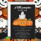 Celebrate your fall baby shower in festive style with this charming “A Little Pumpkin is on the Way” invitation. Featuring a cute ghost peeking out of an orange pumpkin surrounded by autumn gourds, this Halloween-inspired design is perfect for parents-to-be who love seasonal themes. The bold black background makes the playful artwork and modern white lettering pop, creating a stylish yet whimsical look. Personalise with your shower details for a memorable invitation that’s ideal for autumn celebrations, pumpkin-themed baby showers, or October gatherings.