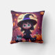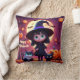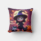 This Pillow features a cute little witch in a black costume with cats and pumpkins on Halloween night.