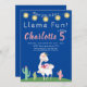 Have a fiesta with this whole llama fun birthday party invitation. This design features a string of star-shaped party lights with a dark blue background with cactus and a llama decorated with a crown and flowers.