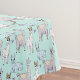Tablecloth with a cute pattern featuring whimsical llamas. One is laying down, one is holding a flower in his mouth, and one is looking at you suspiciously. These animals have lots of charming character.