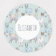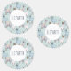 Personalised waterproof labels with a cute pattern featuring whimsical llamas. One is laying down, one is holding a flower in his mouth, and one is looking at you suspiciously. These animals have lots of charming character. Set on a green polka dot background. Layered over top is a white circle with your text inside.
