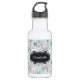 Personalised water bottle with a cute pattern featuring whimsical llamas. One is laying down, one is holding a flower in his mouth, and one is looking at you suspiciously. These animals have lots of charming character. Set on a green polka dot background. A fancy vintage style frame with your name inside.