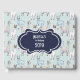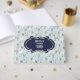 A personalised guestbook with a cute pattern featuring whimsical llamas. One is laying down, one is holding a flower in his mouth, and one is looking at you suspiciously. These animals have lots of charming character. Set on a green polka dot background. Layered over top is a vintage fancy frame in navy blue and white with your text inside.