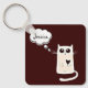 Square metal keychain with adorable sad kitty holding a heart with thought bubble to personalise with a name.
