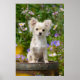 A young long-haired cream white colored Chihuahua dog sitting in a flowering garden, photo taken by Katho Menden. This photographic print on poster paper is a gift idea for dog lovers.