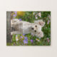 A young long-haired cream white coloured Chihuahua dog sitting in a flowering garden, photo taken by Katho Menden. This animal photo puzzle game is a gift idea for dog lovers. http://www.zazzle.com/kathom_photo