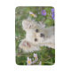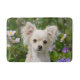 A young long-haired cream white coloured Chihuahua dog sitting in a flowering garden, photo taken by Katho Menden. This bath mat is a gift idea for dog lovers.