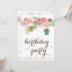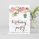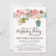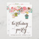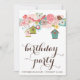 Illustration of pink and brown lovebirds surrounded by whimsical and colourful flowers and hanging bird houses. This invitation will be perfect for summer and spring birthday parties.