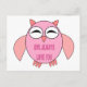 This cute postcard features a cute cartoon of a pink owl with sleepy eyes, a small beak and cute little feet. There is bright pink text inside the owls tummy that says, “Owl Always Love you”. This is the perfect gift for showing someone special how much you love them.