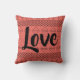 Cute geometric pattern throw pillow with the word Love in script. Black print on coral background.