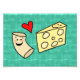 Mac Loves Cheese, Funny and Cute Macaroni & Cheese Cartoon Graphic Illustration features tan noodle, red heart and yellow cheese triangle block with holes, some with a teal geometric background. Yummy carbohydrates in what some would consider an unhealthy meal, except for a cool kid or trend setter! Both caricatures are smiling and happy in love. Would make a super-cute clever idea for the kitchen cook. Design Copyright © CuteComfy.com