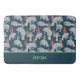 Adorable ocean themed bath mat featuring cute manatees swimming amongst seagrass, in grey and coral peach colours over navy blue. You can customise the text to add your own name or message