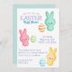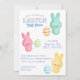 This custom event invitation features a colourful Easter theme. Cute marshmallow bunnies are pictured with decorated eggs next to each bunny. The pastel Spring colours are perfect for a fun, Easter egg hunt.