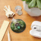 A cute hedgehog holding an emerald heart peeks out from a patch of lilies of the valley in a peaceful forest.