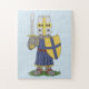 A cute cartoon knight clad in mail and great helm holds his sword high, ready to defend his castle.