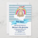 A yoga themed birthday party invitation, with a cute cartoon illustration of a meditating sloth. Wearing a crown of flowers, sitting on a white cloud with a colourful rainbow behind. A couple of hearts nearby. A blue and white striped background.