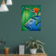Mermaid Art fantasy poster by Sue Halstenberg. A mermaid sits atop blue fish and toots her own seashell horn.