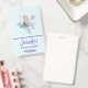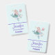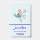 Name badge with an adorable illustration. Designed with a pretty mermaid girl riding a happy dolphin. A little jellyfish friend accompanies them. Decorated with little splatters of faux gold glitter. Light blue background with faded pink polka dots.