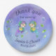 Celebrate your twin girls birthday party with a sweet "Under the Sea" magical ocean life theme. Thank your guests and offer them food, cake, and ice cream with these cute thank you birthday paper plates for twins girls with a soft blue and purple background. These mermaid paper plates for twin girls birthday features two pretty mermaids holding gold stars. Ocean flowers, green leaves, and clamshells the purple paper plates with mermaids for twins birthday or for a 1st birthday party for twin girls. Personalise with two first names.