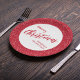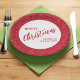 This design features a Christmas holiday calligraphy script paper plate with a merry Christmas cute typography, a simple minimalist minimal, cute simple calligraphy script, stylish trendy typography lettering, stylish trendy classic classy timeless, festive minimalist minimal traditional, festive holiday red and white, a creative simplistic elegant elegance, holiday party disposable paper supplies