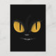 A cute and mischievous looking black cat with big almond shaped yellow eyes and cute little white fangs blending in on a black background.