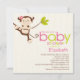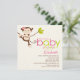 Start your safari baby shower off right with our sweet jungle monkey baby shower invitation. Our monkey shower invitation features the sweetest little monkey with a flower swinging on a tree branch set on a beige stripe background with a monkey coordinating back. Visit our shop to view our matching thank you note cards, postage and stickers. ©Petit Tatti