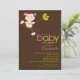 Start your safari baby shower off right with our sweet jungle monkey baby shower invitation. Our monkey shower invitation features the sweetest little monkey with a flower swinging on a tree branch set on a trendy brown background with a monkey coordinating back. Visit our shop to view our matching thank you note cards, postage and stickers. ©Petit Tatti