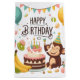 Make birthdays extra special with this adorable design featuring a happy monkey in a party hat celebrating with a delicious cake, colourful balloons, and sweet treats! Perfect for kids' birthday invitations, cards, party favours, decorations, and gifts. This charming design brings joy and fun to any birthday celebration.