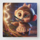 This image showcases an adorable baby monkey with large, expressive eyes. The monkey is wearing a pink dress with white polka dots and a matching pink bow on its head. It stands on a dirt path, reaching out towards a string of twinkling fairy lights draped on a tree trunk. The scene is set in a dimly lit forest, with soft lighting highlighting the monkey and the lights.