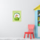 A poster with an illustration of a little monkey peeking out from behind a green bush. Surrounded by a wreath of tropical leaves. Hello written above his head. Set on a green watercolor background.