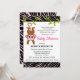 © 2012 Socialite Designs. Pink with black zebra stripes and cute little monkey girl design baby shower invitation. A charming invite to send to guests to celebrate the upcoming birth of a baby girl.