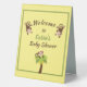 Cute monkeys and casual text combined on light grey background with thin green frame : a fun way to welcome baby shower guests. Personalise this table tent sign with Parents-to-be name