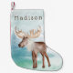 Watercolor illustration features cute moose with winter scene background. Personalise with customisable text in modern brown font