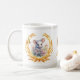 White and grey floral mug with mouse and wheat wreath. White with grey borders. Part of a matching set of kitchen decor.