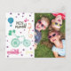 Adorable moving announcement postcards with family photo on the front with a cute rainbow coloured illustration of a bike, car, key, air balloon and "We've moved!" text. On the back of the postcard is a quirky, fun little house with the new address details inside and the hand-lettered "New Home Sweet Home" on top.