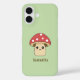 A green phone case with an illustration of a cute mushroom in cartoon style and customisable text below! It could be perfect for a kid or a friend who loves Kawaii character and nature!