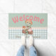 A whimsical fairy tale portrait of a fancy frog lady wearing a mushroom hat and holding mushrooms. Cute cottagecore and woodland animal painting reminiscent of children's book illustrations. Adorable vintage green gingham door mat is customisable and allows you to personalise by adding your name!