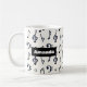 A mug with a musical themed design. A pattern with treble clef, bass clef and other musical symbols.